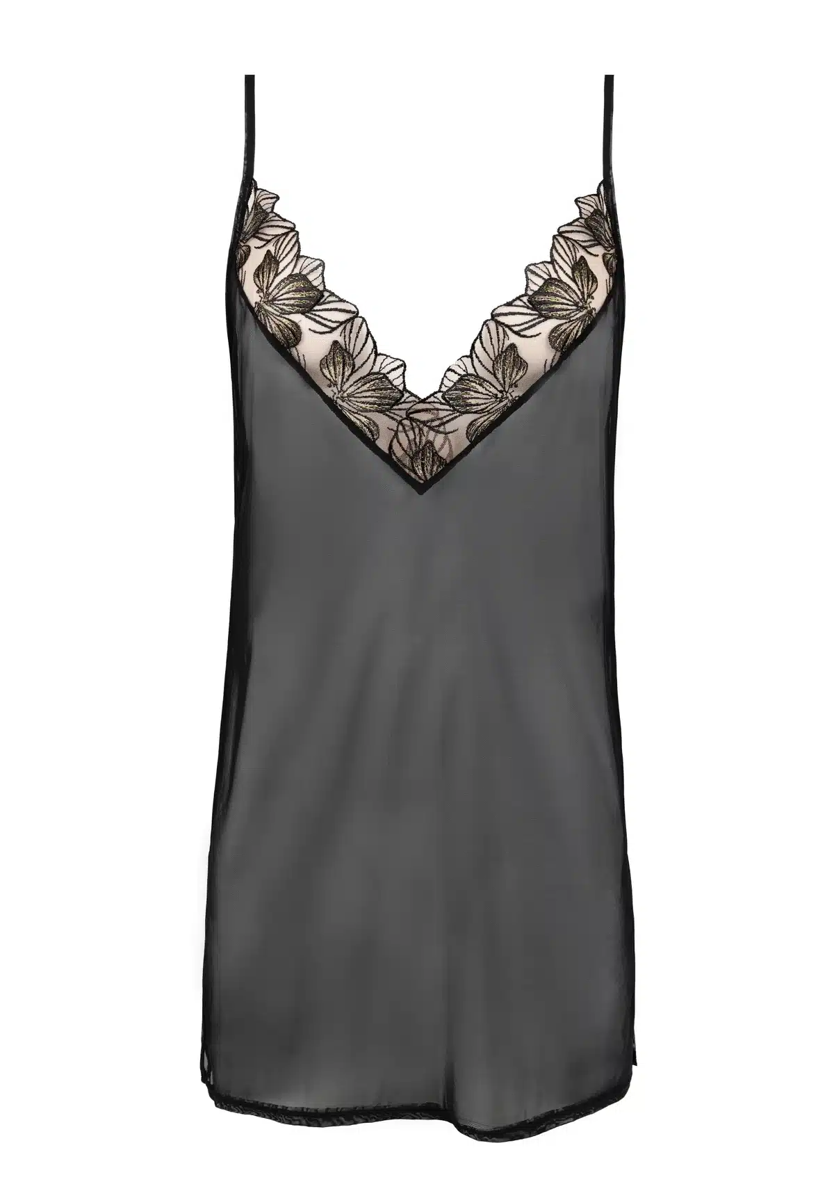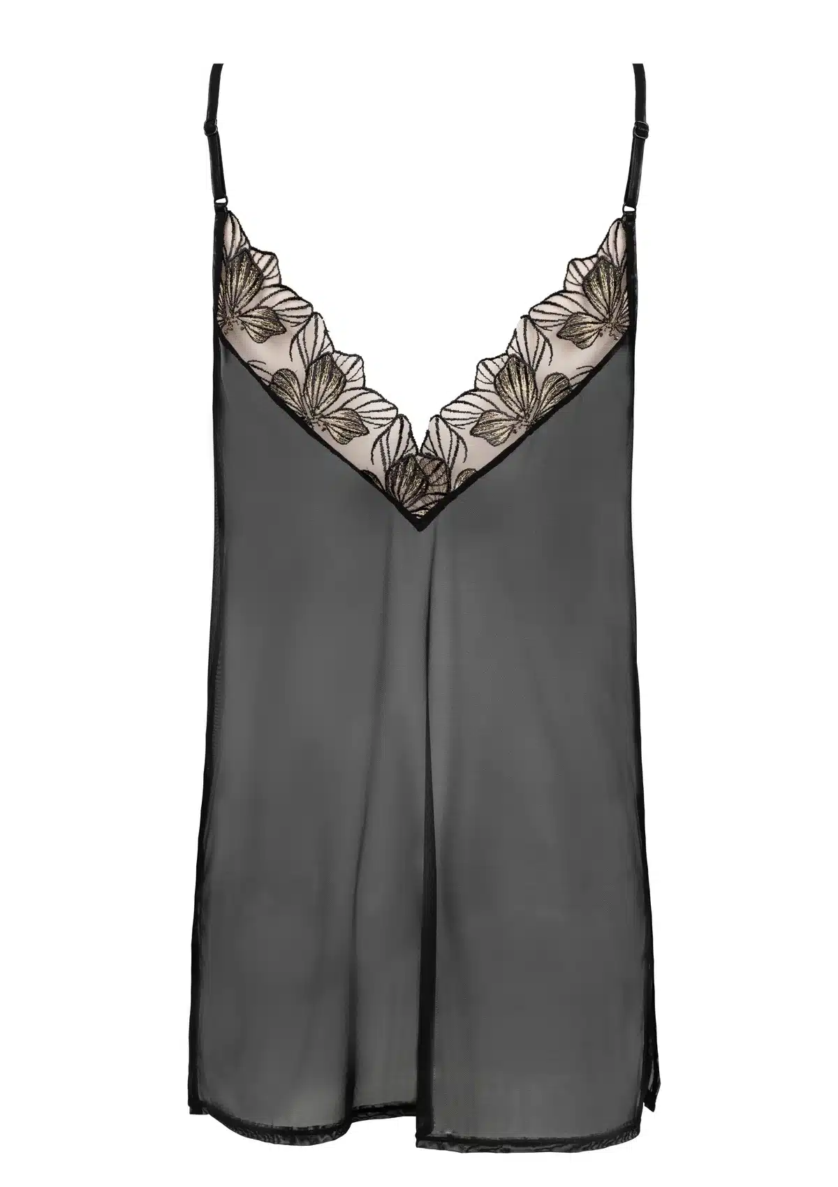 This new shape within the Après Minuit collection takes the classic triangle bra to the next level. The half-moon underwires offer light but effective support and create a beautiful deep cleavage, while the cups are fully finished in delicate black floral embroidery on a skin-colored tulle.