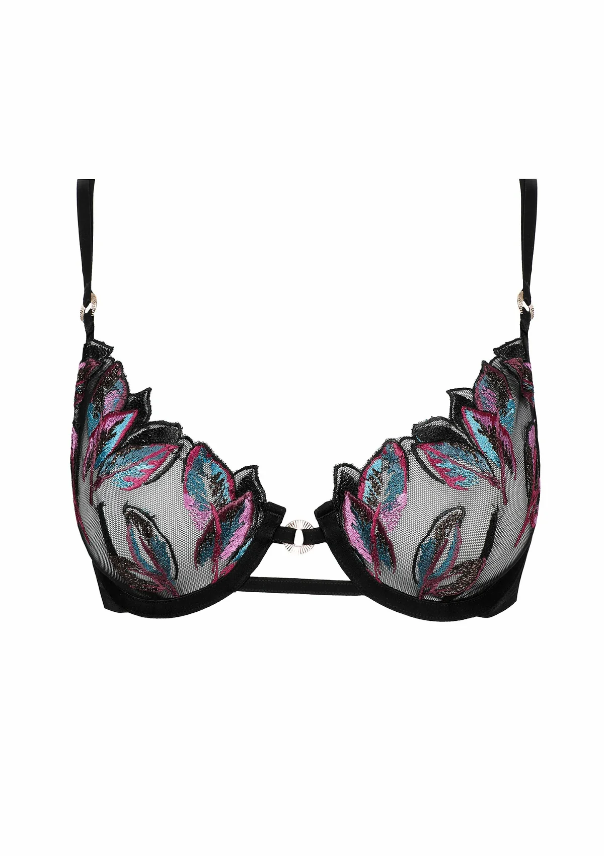 The Oiseau de Paradis Half Cup Bra is elegant, feminine and sophisticated. The combination of embroidered cups, jeweled details and the openwork centerpiece makes this a timeless and luxurious lingerie piece.