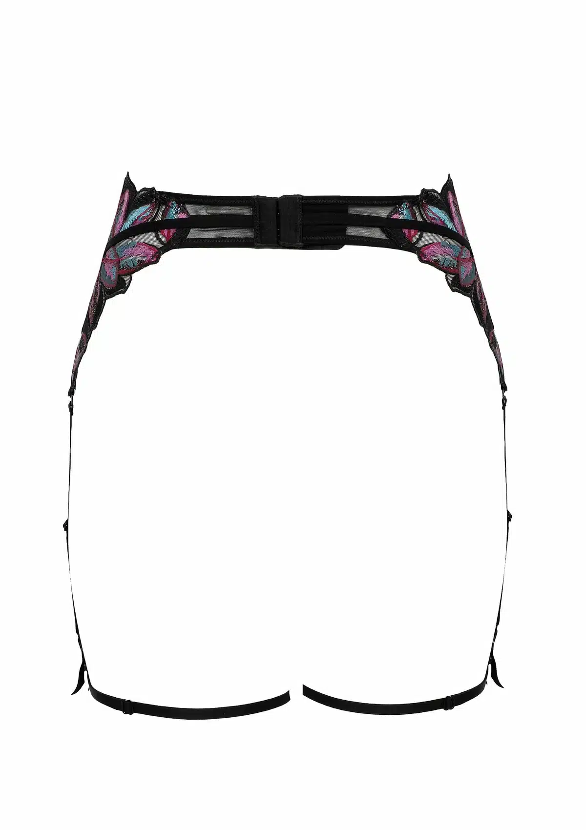 The Oiseau de Paradis suspender belt is a sophisticated and feminine lingerie item, fully executed in rich multicolor embroidery. This suspender belt elegantly shapes the waist and emphasizes the body’s natural curves.