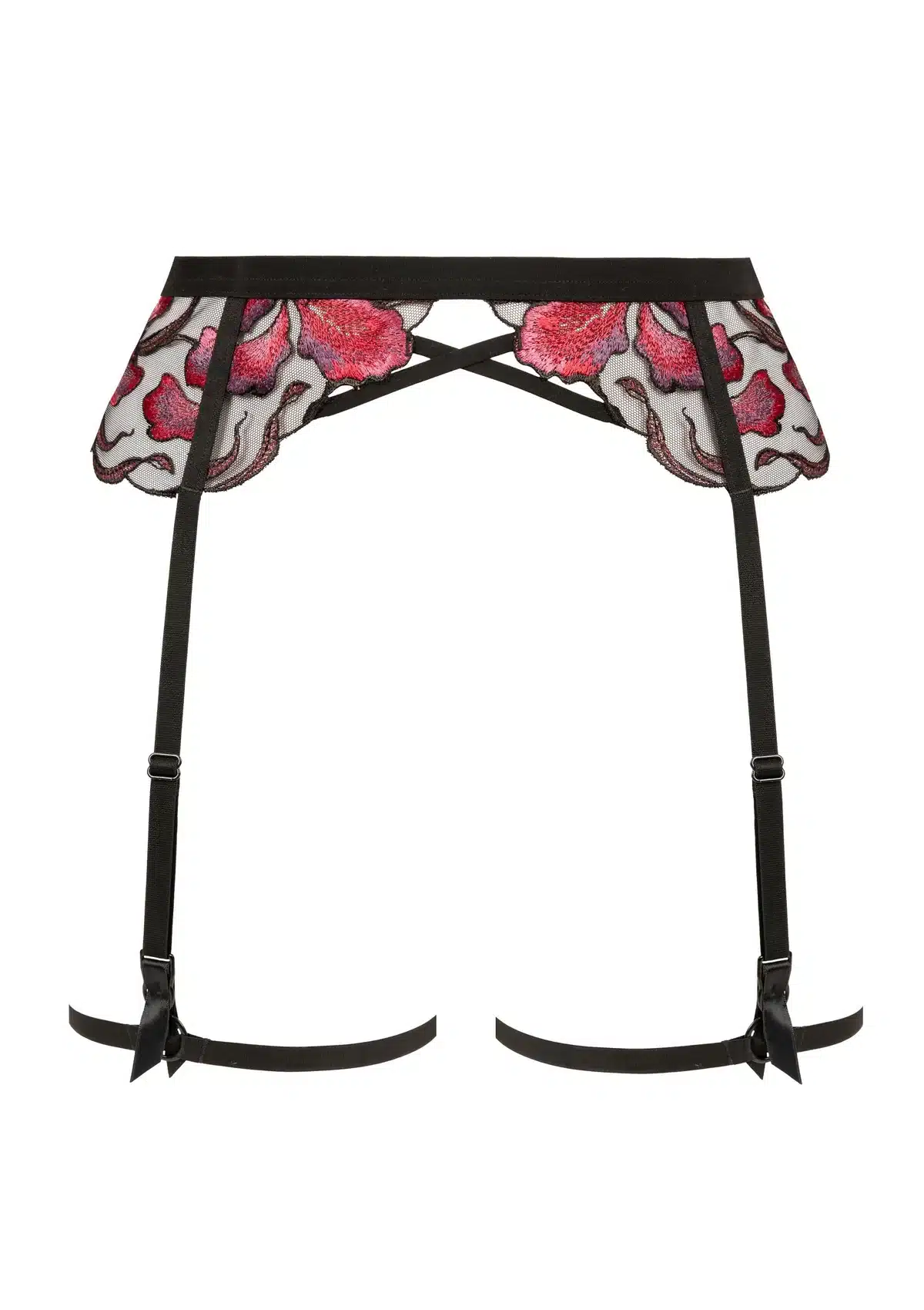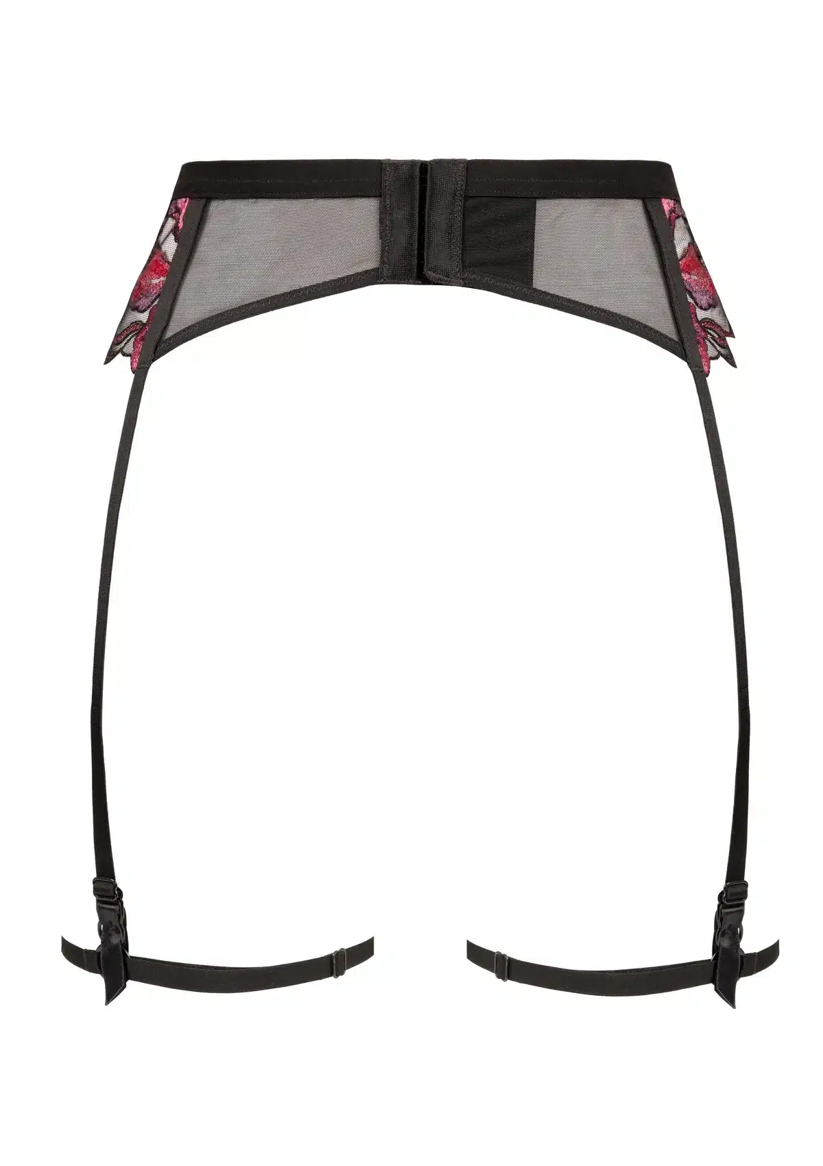 This suspender belt is made in black tulle and richly decorated with embroidery in different shades of ruby and fuchsia, giving an elegant and sensual look. The waistband is elasticized for a comfortable and flexible fit, and the crotch detailing in the front emphasizes the waist in a flattering way.