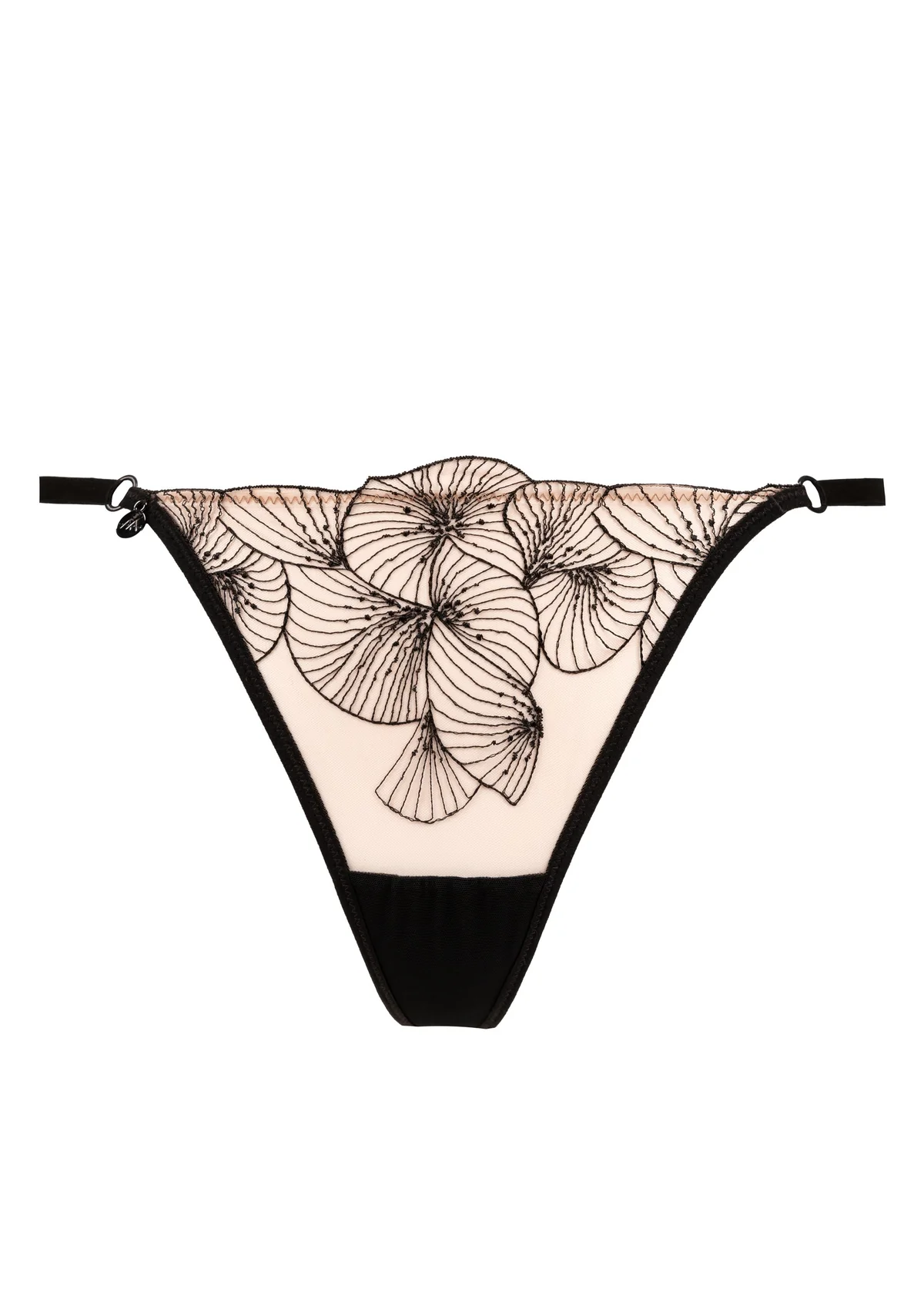 Thong Menu Plaisir: sophisticated and sensual thong with matching floral embroidery. The front is subtle embroidery on transparent tulle, the sides are adjustable and the crotch is lined with cotton for extra comfort.