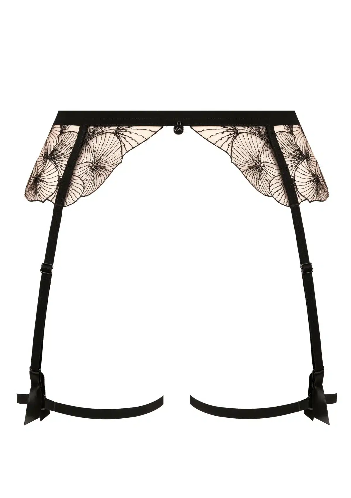 Garter belt Menu Plaisir: elegant waistband in the same floral embroidery, with adjustable garters that can be worn with matching stockings or loose for a sexy look.