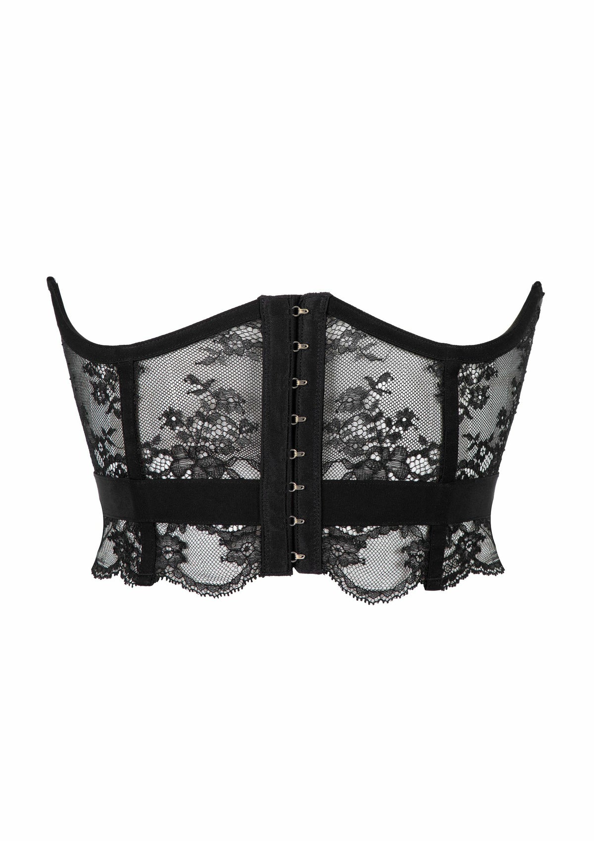 Open Bustier – a sensual design featuring underwire, sheer tulle and a front opening with gold hooks. Combines support with a bold, luxurious look.