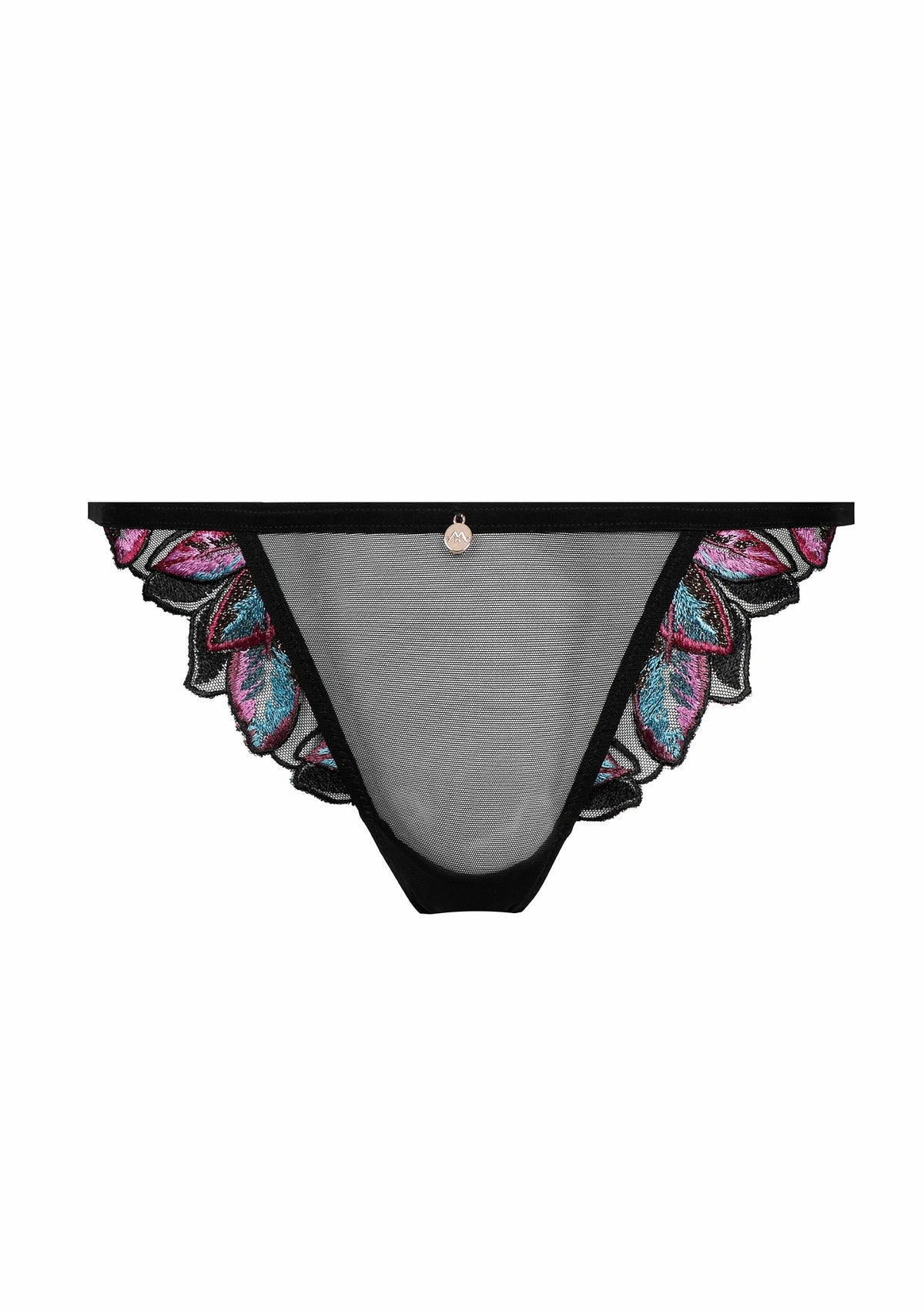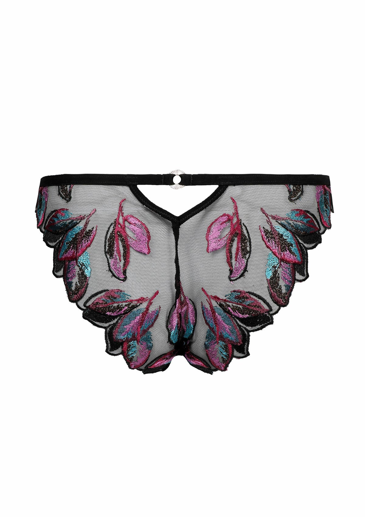 The Slip Oiseau de Paradis is an elegant and sensual slip that perfectly balances transparency and colorful embroidery. The front is rendered in black tulle, richly decorated with delicate multicolored embroidery that subtly accentuates the silhouette.