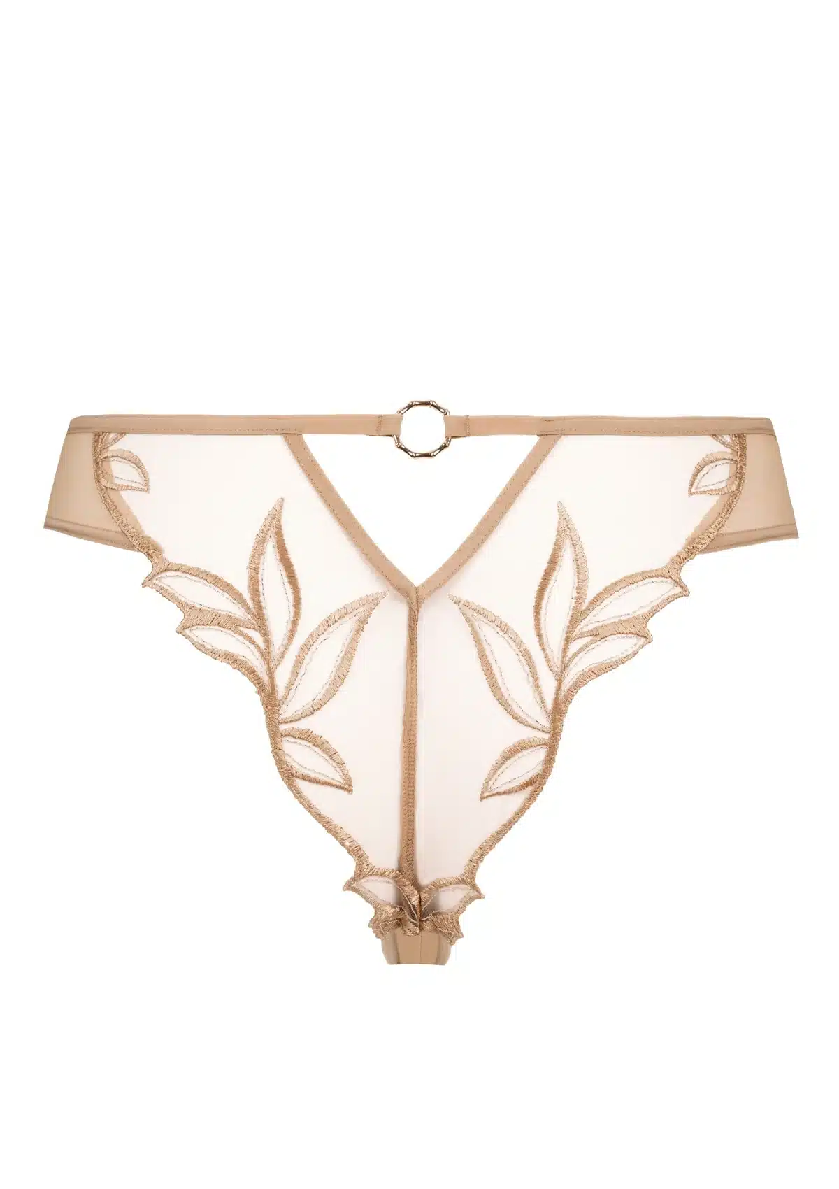Soft, sheer black tulle emphasizes natural curves, while graphic botanical embroidery elegantly frames the hips and lower back. The placement of the embroidery enhances the silhouette and gives the tanga an airy, modern allure. This variant comes in the elegant DUNE shade, a warm body color that gives the design an extra sophisticated look.