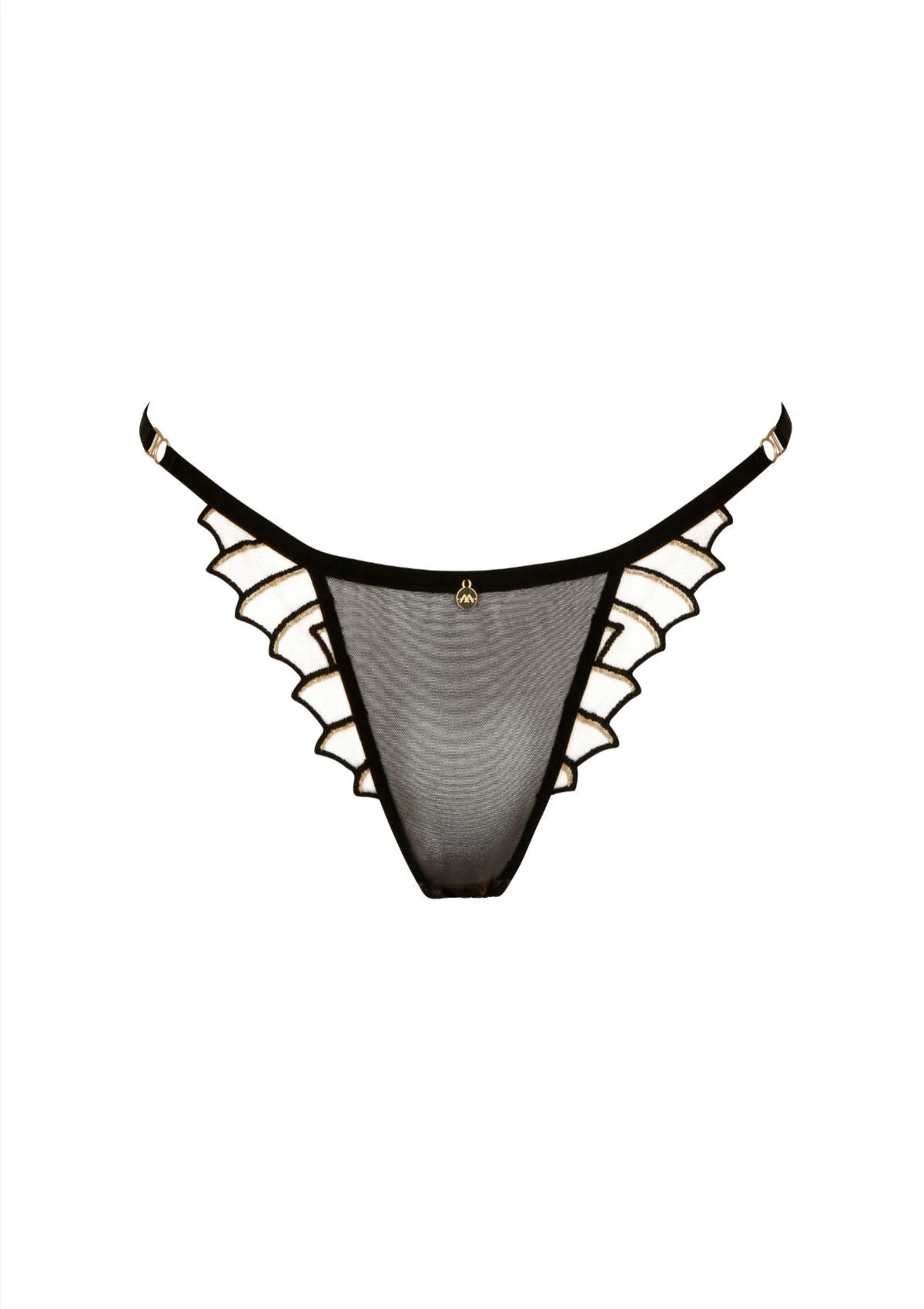 The Slip Cosmic Dream is an elegant and seductive lingerie item that perfectly combines transparency and comfort. Rendered in black, soft tulle and enriched with graphic embroidery with copper-colored reflections, the briefs create a subtle shimmer on the skin.