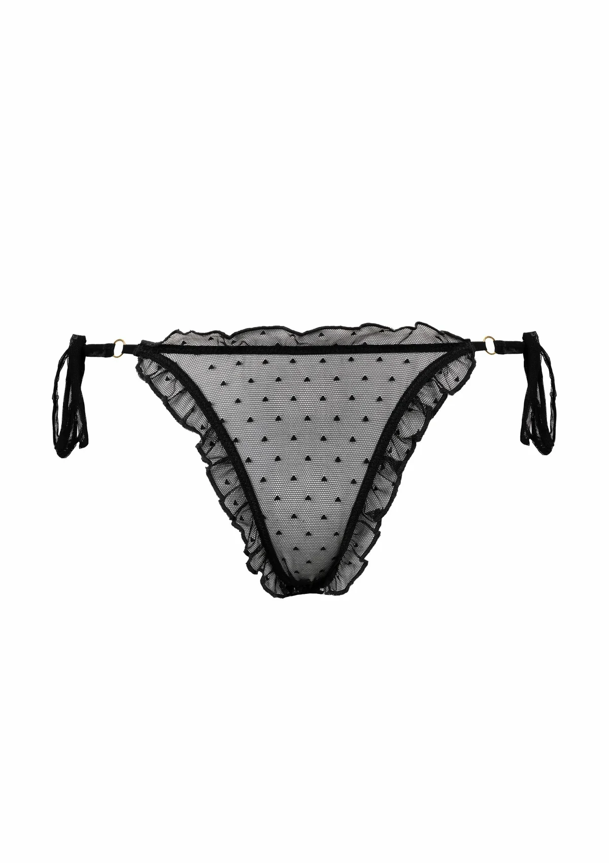 The front panel is finished with a delicate lace gallon, while small gold rings and a subtle jewel detail add a luxurious touch. The elastic sides are adjustable, allowing the thong to mold perfectly to the body and provide a comfortable fit.