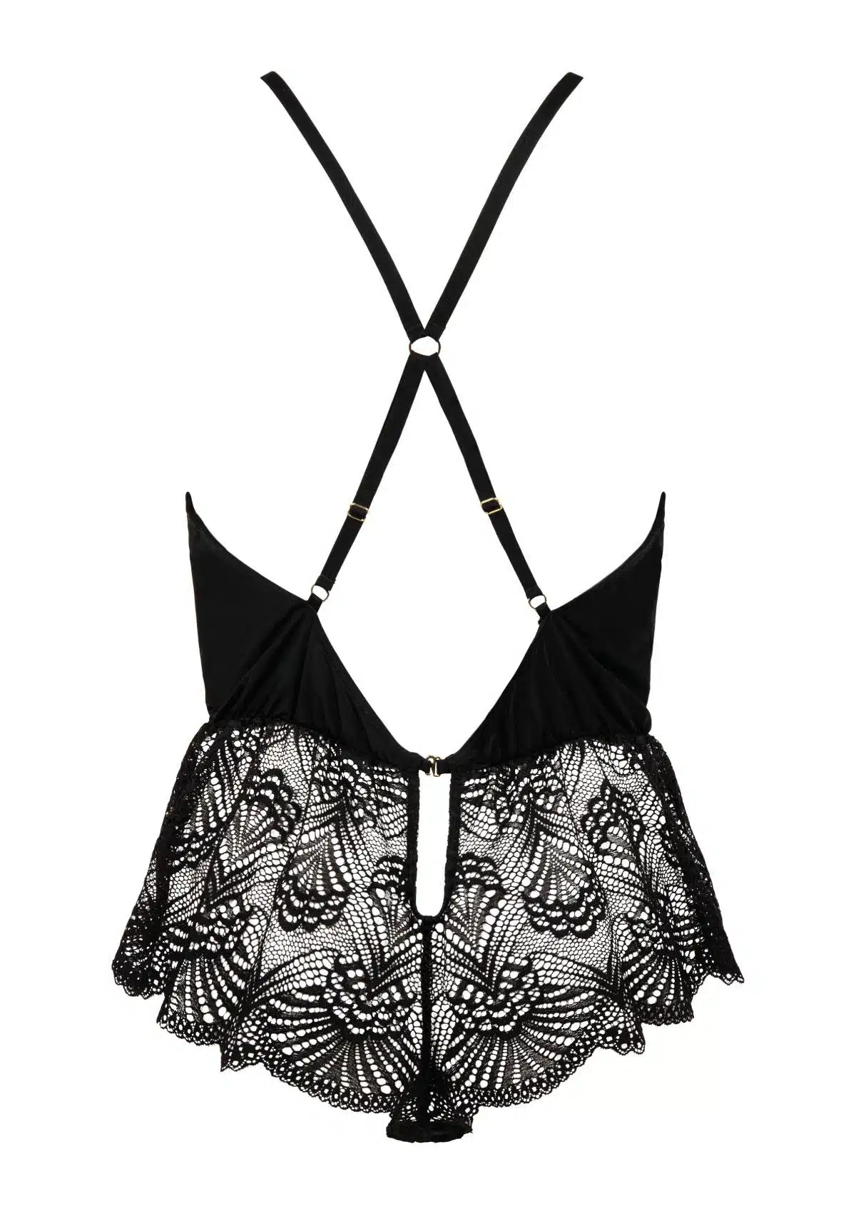 The shorty is made entirely of lace and falls smoothly around the body. The back is a real eye-catcher with crossed straps, a deep open back and a subtle drop opening low on the back. A versatile piece that can be worn both as lingerie or nightwear – indoors or out.